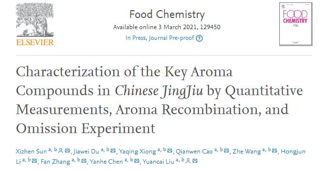 近日,国际学术期刊食品化学(food chemistry,中科院1区,影响因子为6.306)在线发表了《通过定量分析,香气重组和缺失实验表征中国劲酒中的关键香气活性化合物》的研究文章。撰稿人正是来自劲牌研究院的风味研究小组。
